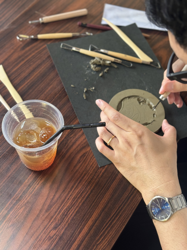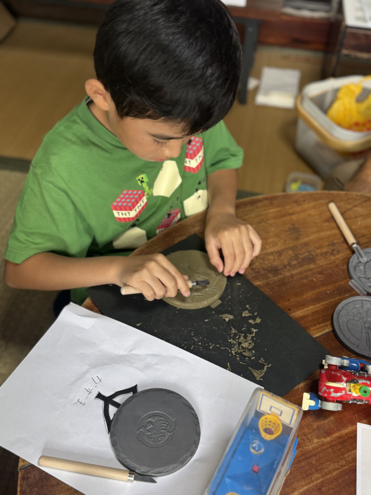 描きたいイラストを瓦に彫刻する体験は、みなさん真剣そのもの。