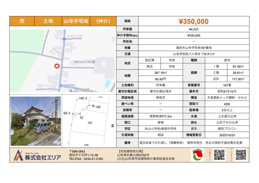 | 備考 | 現況有姿での引渡し(残置物有) 境界非明示 売主の契約不適合責任免責 |