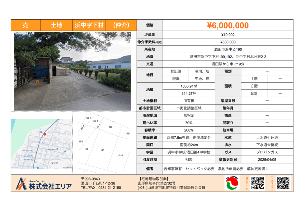 売土地 酒田市浜中字下村