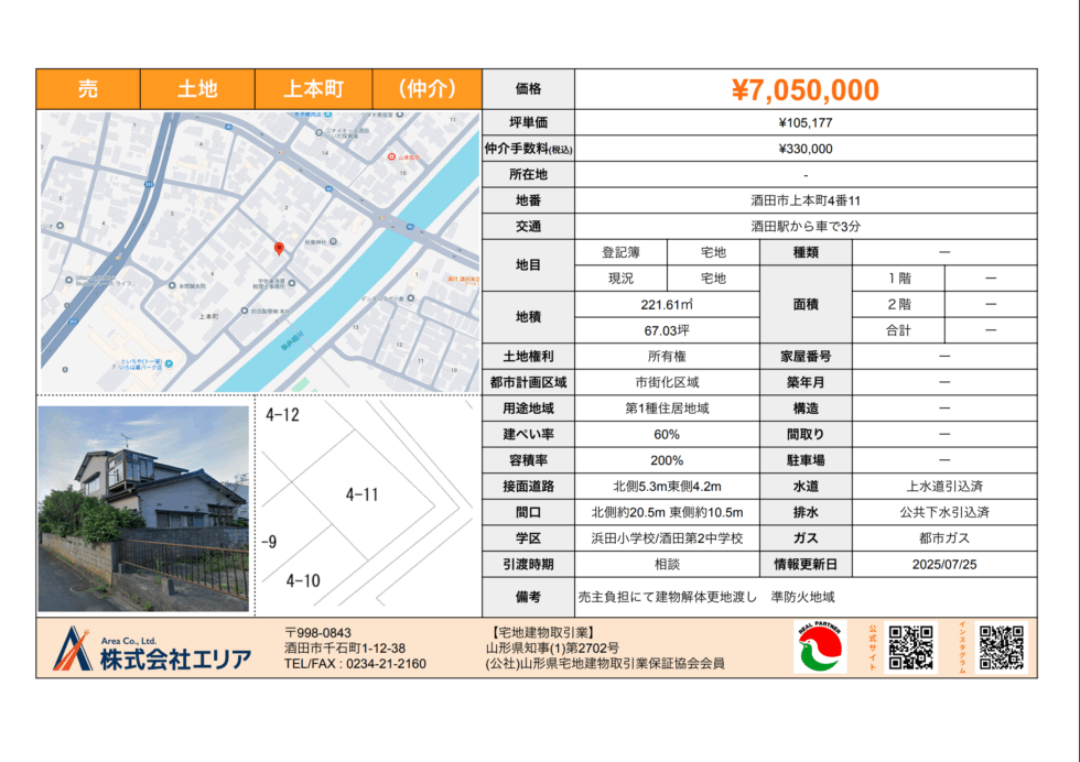 売土地 酒田市上本町